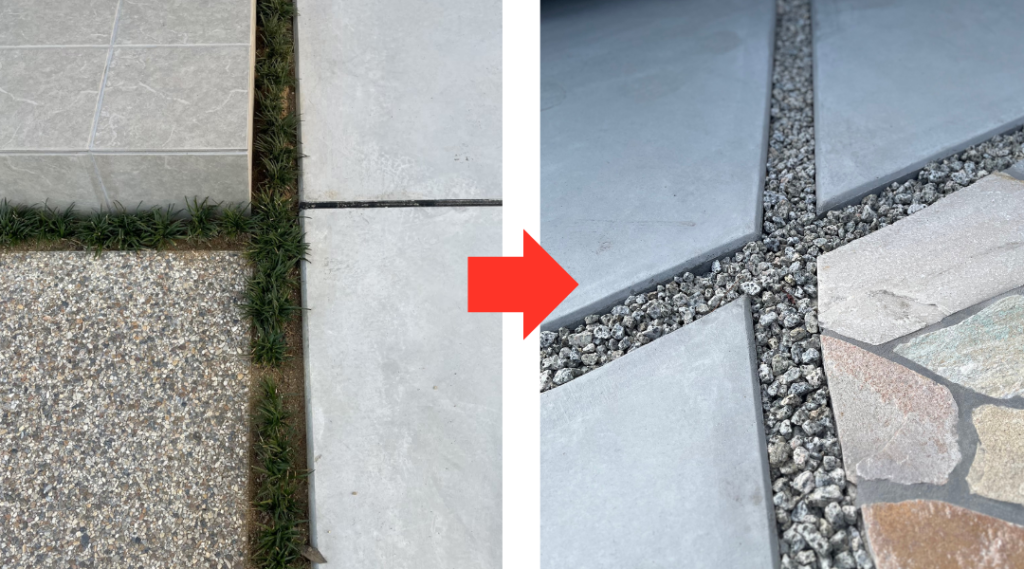 コンクリートやタイルのつなぎ目を目地と言いますが、植栽は華やかで優しい雰囲気になり、建物にも馴染みやすいですが、メンテナンスも必要な為、防草対策には弊社では目地にも防草シートを敷いているので砂利敷対策がおすすめです。